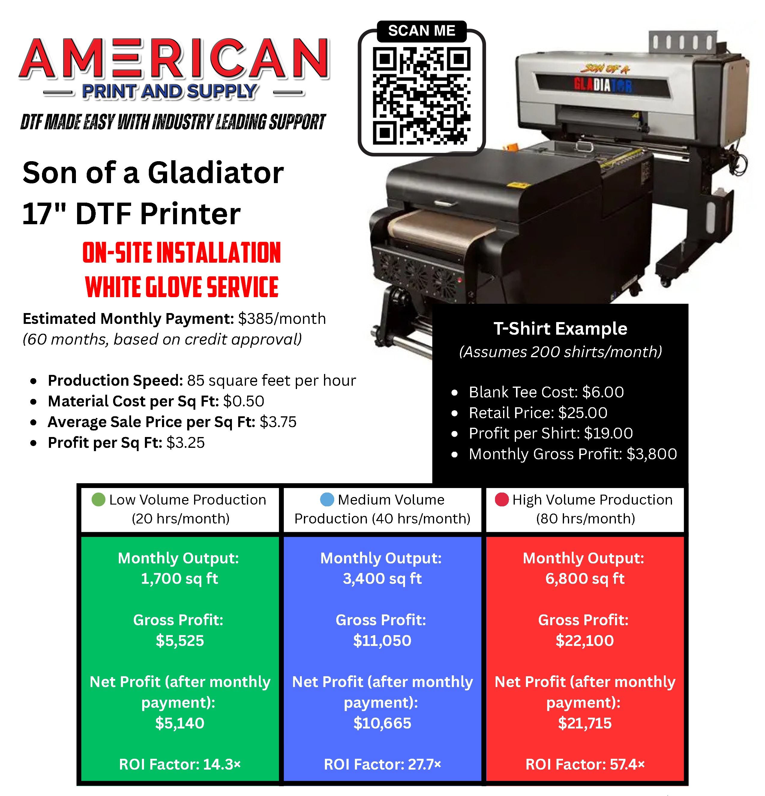American Print and Supply was founded to help decorators reclaim their time, profit, and peace of mind. With hundreds of years of combined industry experience, we provide cutting-edge direct-to-film (DTF) printers, UV printers, and top-tier supplies backed by white-glove installation, expert training, and ongoing support. We’re not just here to move boxes. We partner with businesses to help them grow. Plus, check out TransferDepot.com, AmericanPrintonDemand.com and Gangify.com